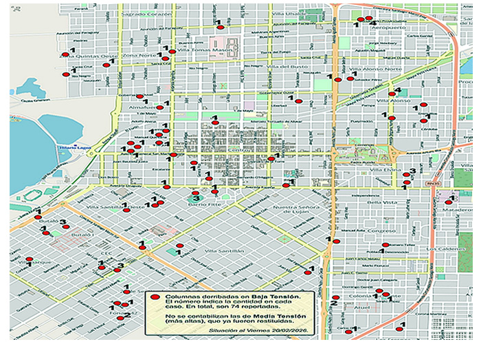 En paralelo, se recuperó la comunicación por fibra óptica de CPEtel entre la Subestación Norte y la Subestación Transformadora Sur, ubicada en el ingreso al Parque Industrial. También se reemplazó una acometida subterránea en la subestación Mansilla, en pleno centro. Durante la noche del jueves comenzaron tareas de reconexión en la zona oeste céntrica y sectores cercanos al predio Don Tomás. Para este viernes se programaron trabajos en áreas suburbanas, incluyendo la ruta nacional 5, la zona del relleno sanitario y Colonia Lagos.